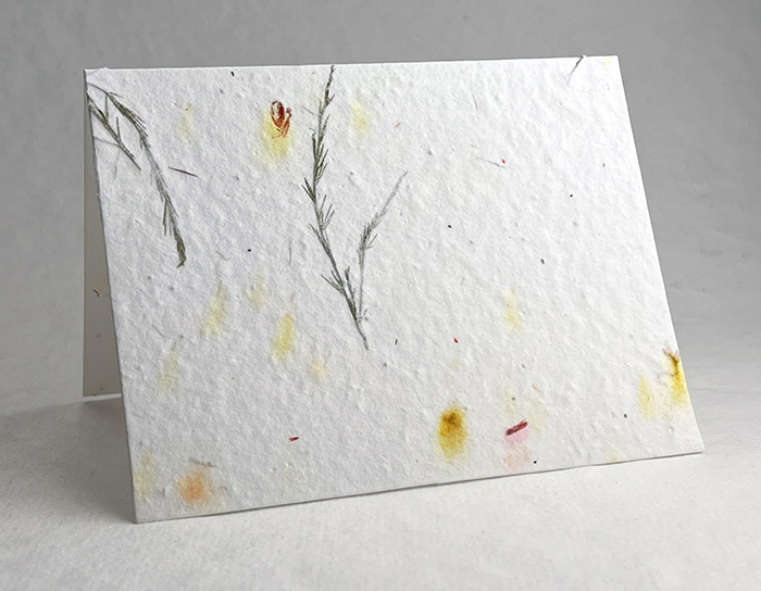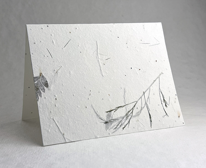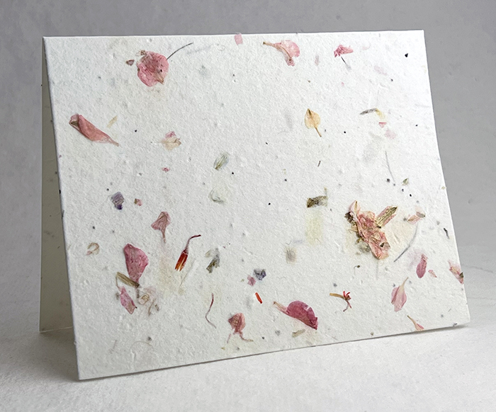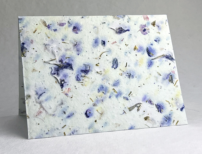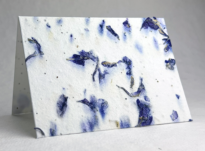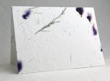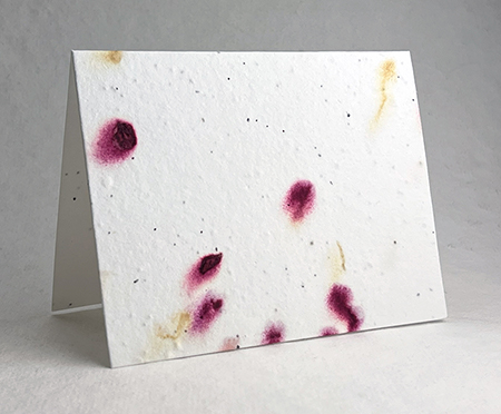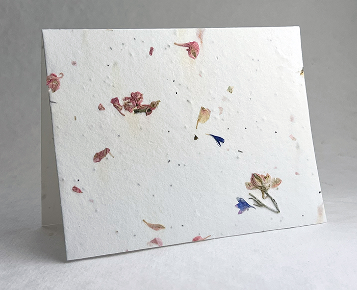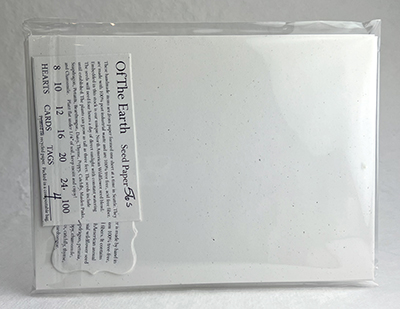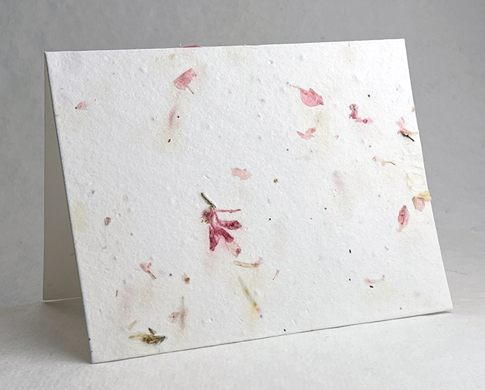 These cards measure 8.5 x 5.5 when open flat, 4.25 x 5.5 when folded. The envelope and planting guide are recycled paper and the protective sleeve is compostable. The locally made handmade paper contains a wildflower seed mix that will bloom if planted with a light covering of soil.