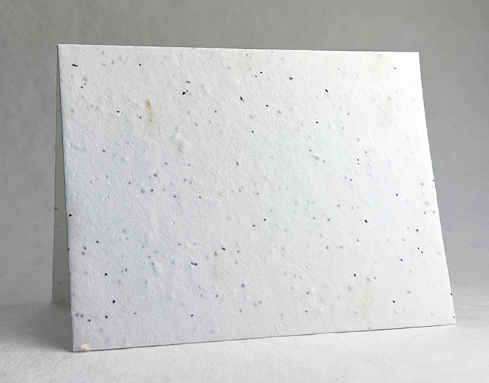 Our handmade papers are formed one at a time with a mould and deckle. They are made with 100% post industrial waste and are 100% tree free, acid free paper. Embedded in this stock is our unique North American Wildflower seed blend. The seeds will need four hours a day of direct sunlight with constant watering until established. The plants can grow to as tall as three feet. The seeds include Snapdragon (annual), Petunia (annual), Beardtongue (perennial), Poppy (annual), Mountain Mint (perennial), Chamomile (perennial). This blend is specifically designed to allow us to print directly onto the handmade seed paper and for safe propagation across North America.
